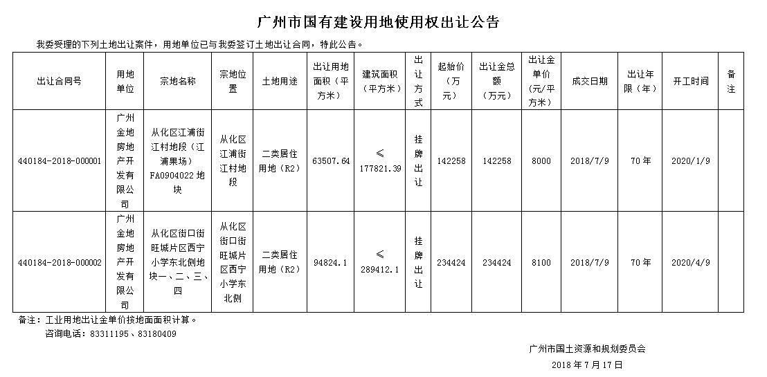广州市国有建设用地使用权出让公告(2018年7月9日成交地块)