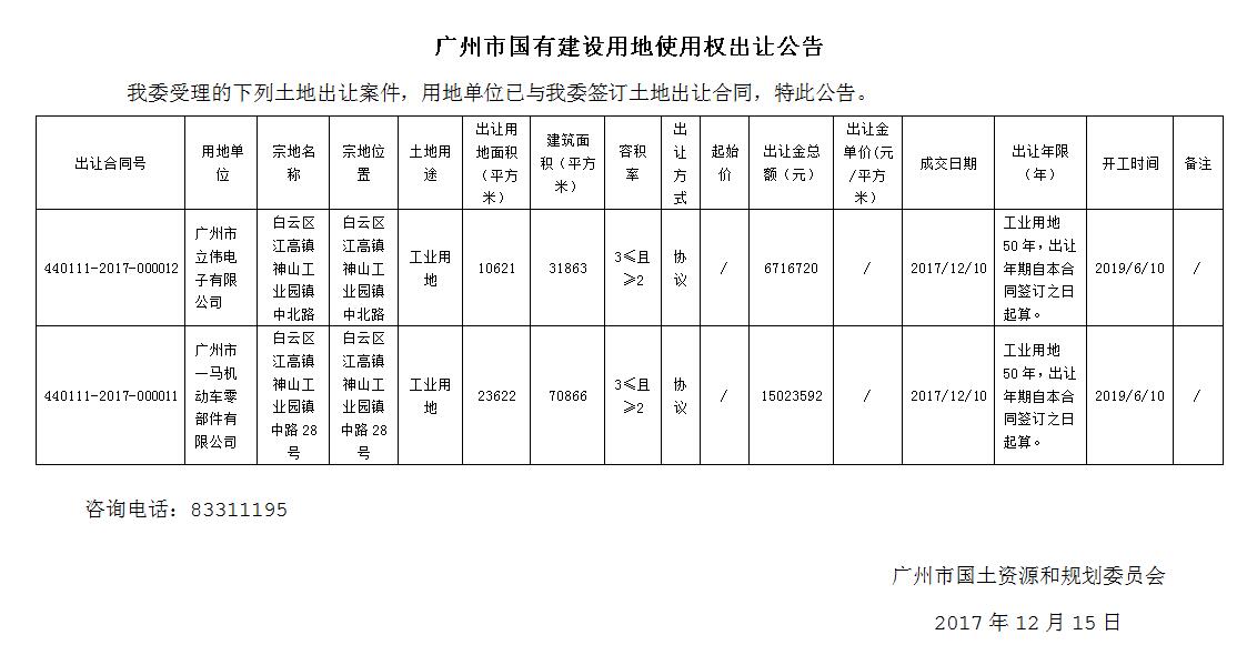 广州市国有建设用地使用权出让公告 (2017年12月10日出让地块)