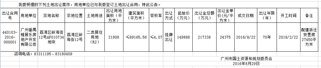 广州市国有建设用地使用权出让公告(荔湾区2016年8月22日成交地块)