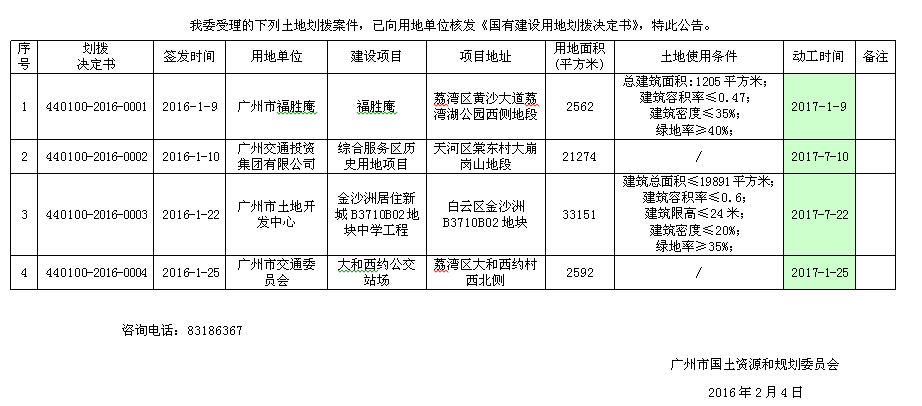 2016年1月广州市国有土地使用权划拨情况公告