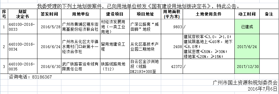 2016年6月广州市国有土地使用权划拨情况公告