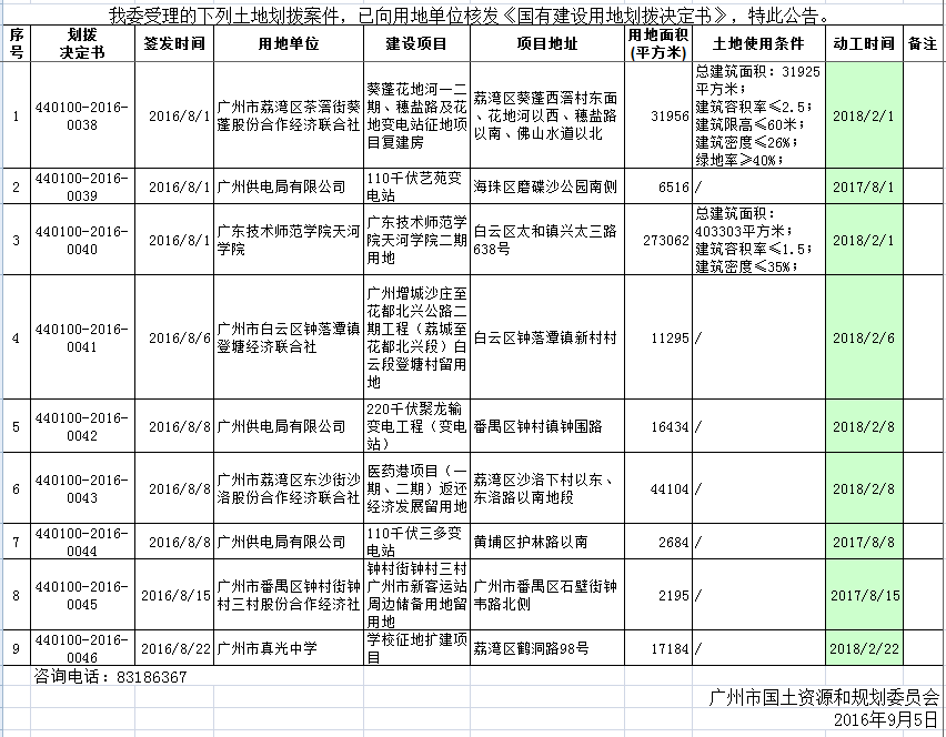 2016年8月广州市国有土地使用权划拨情况公告