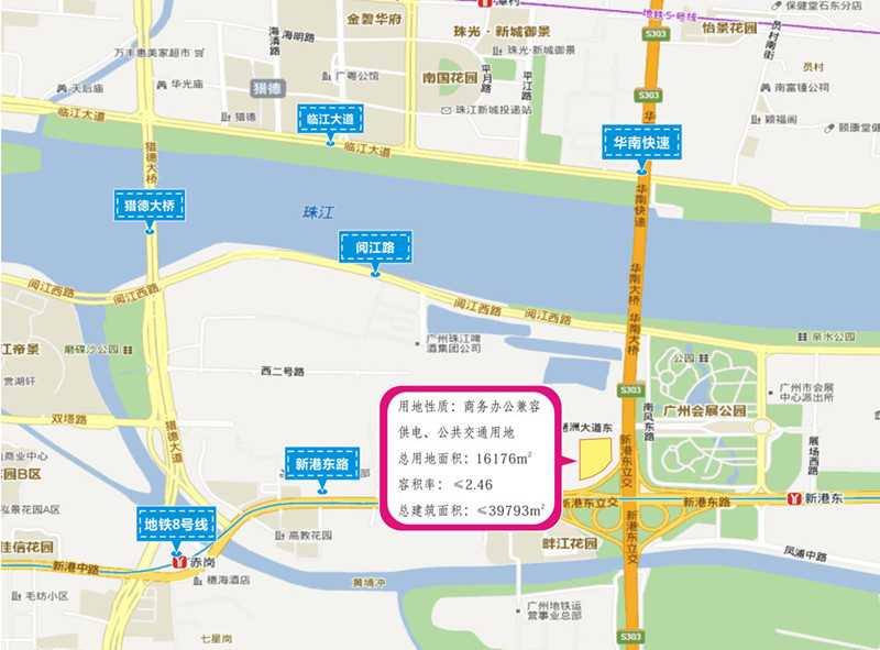 地块位于国际城市中央商务核心区琶洲A区,毗邻华南大桥,接轨地铁磨碟沙站,交通便利。