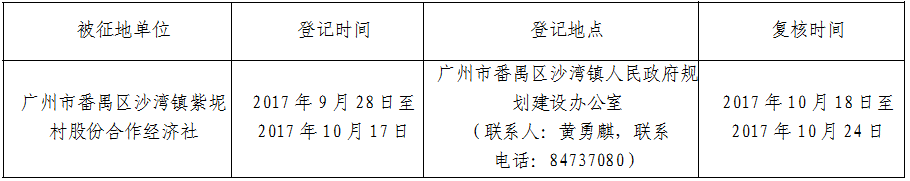 三、被征地村及面积:广州市番禺区沙湾镇紫坭村股份合作经济社,集体土地5.4916公顷(折合约82.3740亩),其中耕地4.1252公顷(折合约61.8780亩),建设用地1.3664公顷(合20.4960亩)。