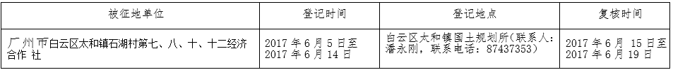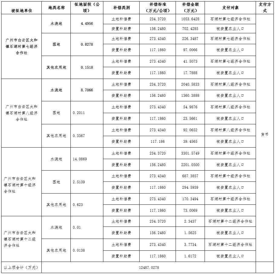 (二)本次征收土地所涉及的被安置农业人员由广州市白云区太和镇石湖村第七、八、十、十二经济合作社以货币补偿的形式安置。请被征地村在本公告期内到广州市白云区国土资源和规划局领取办理安置农业人口征地农转非手续的函件。