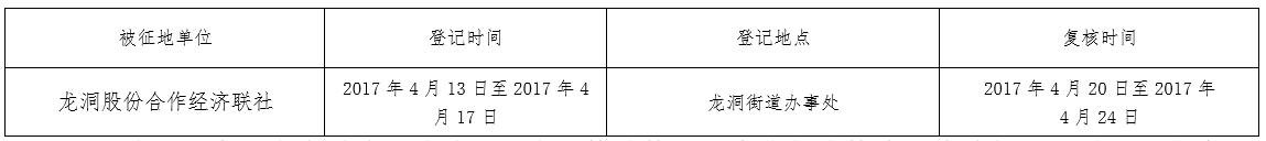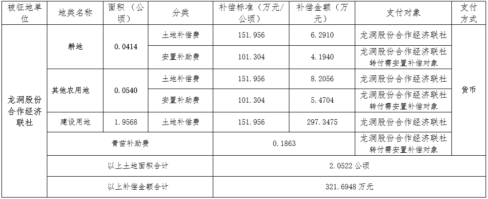 三、被征地村及面积:龙洞股份合作经济联社集体土地面积2.0522公顷(其中耕地0.0414公顷,其他农用地0.0540公顷,建设用地1.9568公顷)