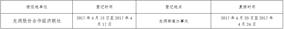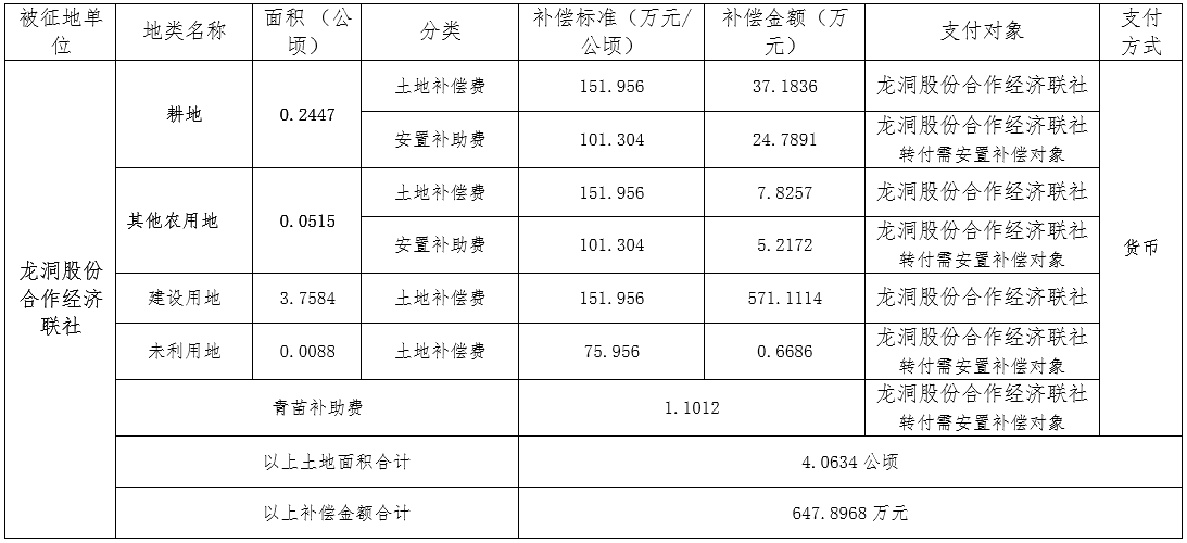 三、被征地村及面积:龙洞股份合作经济联社集体土地面积4.0634公顷(其中耕地0.2447公顷,其他农用地0.0515公顷,建设用地3.7584公顷,未利用地0.0088公顷)