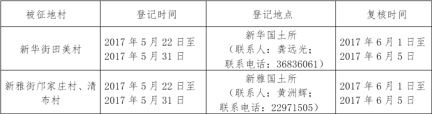 五、被征收土地四至范围内的土地所有权人、使用权人在本公告规定的期限内,持土地权属证书或其他有关证明材料,到指定的地点办理征地补偿登记,请互相转告。