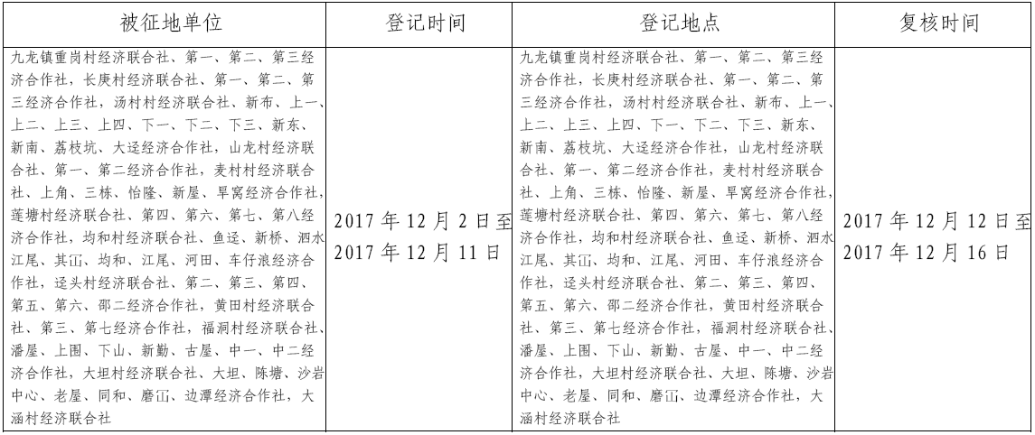 经国务院、省人民政府批准(国土资函〔2017〕485 号文、粤国土资(建)函〔2017〕11 号文),需将广州市黄埔区九龙镇重岗村经济联合社、第一、第二、第三经济合作社,长庚村经济联合社、第一、第二、第三经济合作社,汤村村经济联合社、新布、上一、上二、上三、上四、下一、下二、下三、新东、新南、荔枝坑、大迳经济合作社,山龙村经济联合社、第一、第二经济合作社,麦村村经济联合社、上角、三栋、怡隆、新屋、旱窝经济合作社,莲塘村经济联合社、第四、第六、第七、第八经济合作社,均和村经济联合社、鱼迳、新桥、泗水、江尾、其冚、均和、江尾、河田、车仔浪经济合作社,迳头村经济联合社、第二、第三、第四、第五、第六、邵二经济合作社,黄田村经济联合社、第三、第七经济合作社,福洞村经济联合社、潘屋、上围、下山、新勤、古屋、中一、中二经济合作社,大坦村经济联合社、大坦、陈塘、沙岩、中心、老屋、同和、磨冚、边潭经济合作社,大涵村经济联合社共122.1526 公顷(合1832.289 亩)集体土地征收为国有土地。现将经依法批准的《征收土地方案》和市人民政府批准的《征地补偿安置方案》内容和有关事项公告如下: