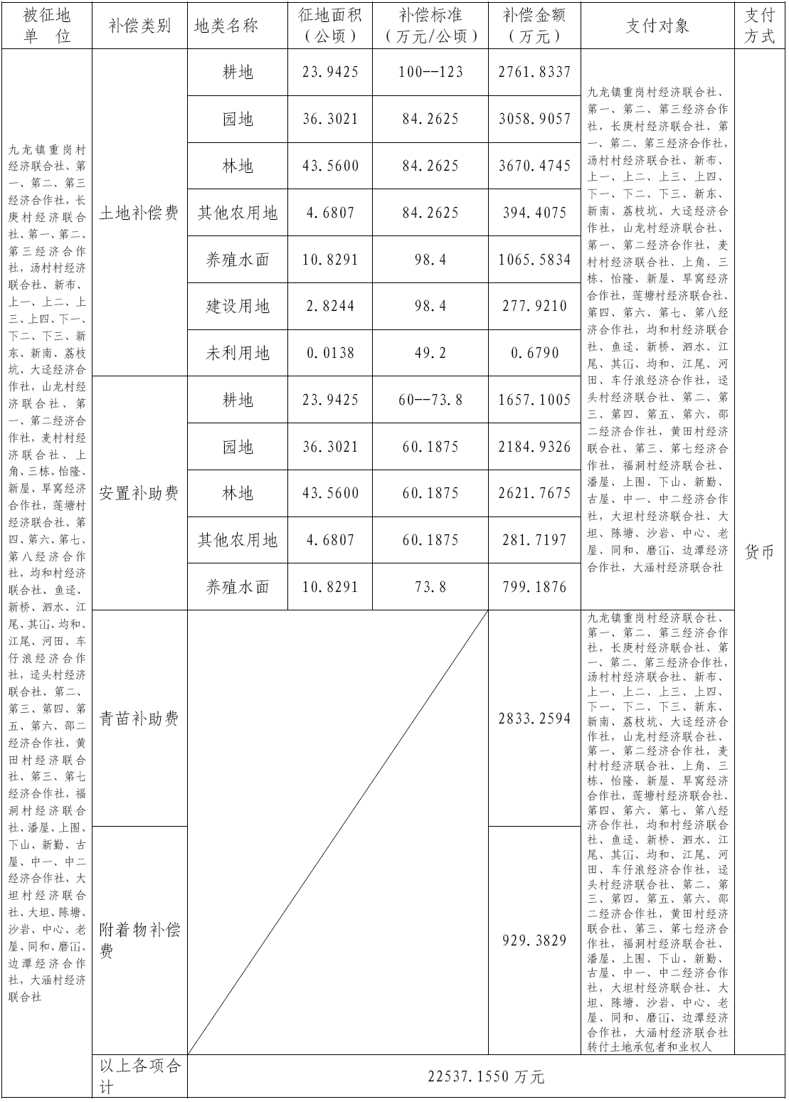 三、被征地村及面积:广州市黄埔区九龙镇重岗村经济联合社、第一、第二、第三经济合作社,长庚村经济联合社、第一、第二、第三经济合作社,汤村村经济联合社、新布、上一、上二、上三、上四、下一、下二、下三、新东、新南、荔枝坑、大迳经济合作社,山龙村经济联合社、第一、第二经济合作社,麦村村经济联合社、上角、三栋、怡隆、新屋、旱窝经济合作社,莲塘村经济联合社、第四、第六、第七、第八经济合作社,均和村经济联合社、鱼迳、新桥、泗水、江尾、其冚、均和、江尾、河田、车仔浪经济合作社,迳头村经济联合社、第二、第三、第四、第五、第六、邵二经济合作社,黄田村经济联合社、第三、第七经济合作社,福洞村经济联合社、潘屋、上围、下山、新勤、古屋、中一、中二经济合作社,大坦村经济联合社、大坦、陈塘、沙岩、中心、老屋、同和、磨冚、边潭经济合作社,大涵村经济联合社属下集体土地122.1526 公顷(合1832.289 亩),其中耕地23.9425 公顷(合359.1375亩),园地36.3021 公顷(合544.5315 亩,其中可调整园地11.7168 公顷(合175.752 亩),林地43.5600公顷(合653.4 亩,其中可调整林地1.2390 公顷(合18.585 亩),其他农用地4.6807 公顷(合70.2105亩),养殖水面10.8291 公顷(合162.4365 亩,其中可调整坑塘水面5.0745 公顷(合76.1175 亩)),建设用地2.8244 公顷(合42.3660 亩),未利用地0.0138 公顷(合0.2070 亩)。