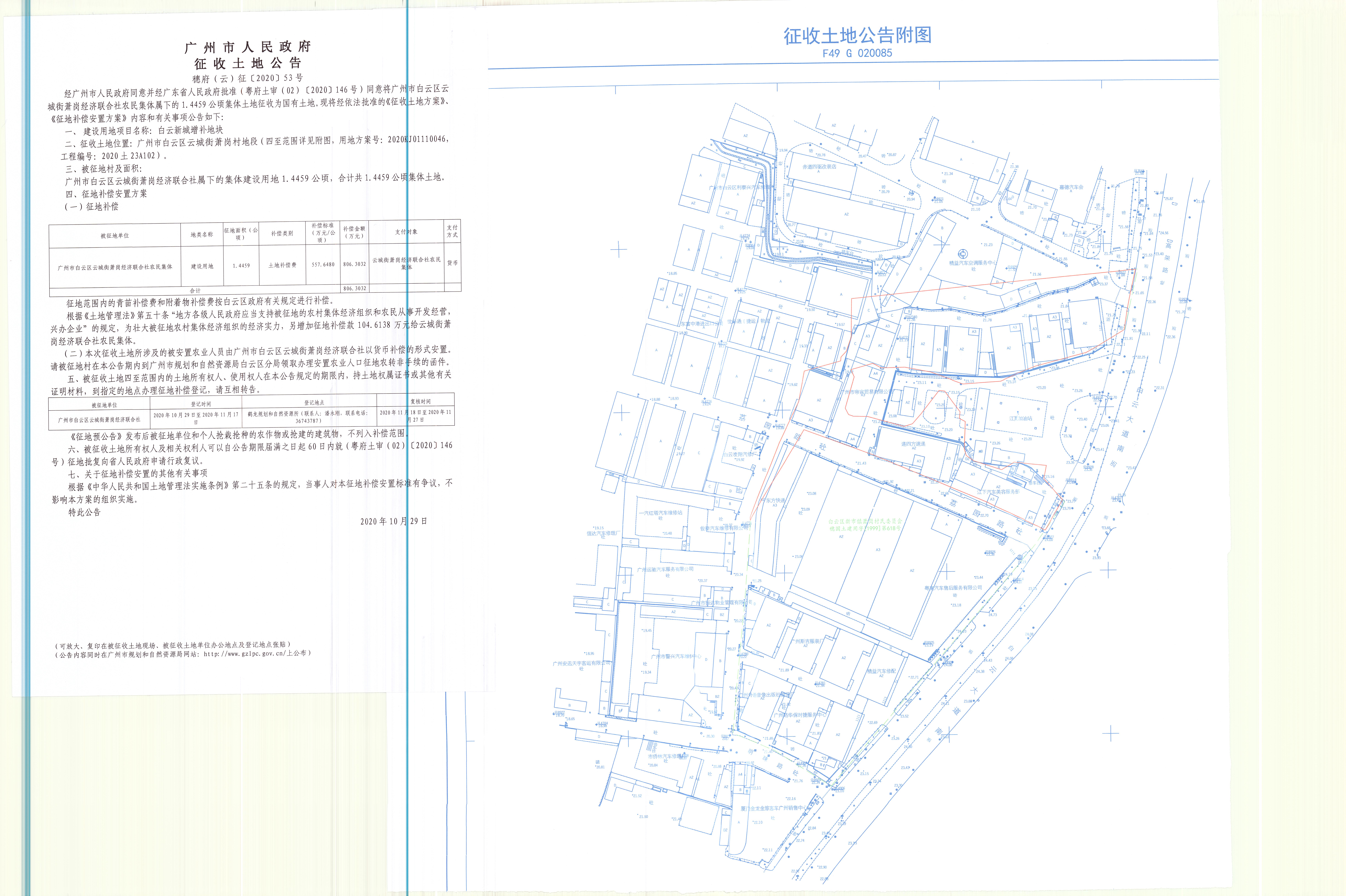 经广州市人民政府同意并经美高梅娱乐城批准(粤府土审(02)〔2020〕146号)同意将广州市白云区云城街萧岗经济联合社农民集体属下的1.4459公顷集体土地征收为国有土地。现将经依法批准的《征收土地方案》、《征地补偿安置方案》内容和有关事项公告如下: