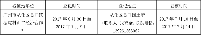 经广州市人民政府同意并经美高梅娱乐城批准(粤国土资(建)字〔2017〕17号)同意将广州市从化区良口镇塘尾村地段0.6851公顷集体土地征收为国有土地。现将经依法批准的《征收土地方案》、市人民政府批准的《征地补偿安置方案》内容和有关事项公告如下: