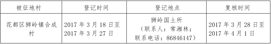 经省人民政府批准(粤国土资(建)字[2014]453号文),需将花都区狮岭镇合成村属下的集体用地0.9026公顷(合13.5390亩)征收为国有土地。现将经依法批准的《征收土地方案》和市人民政府批准的《征地补偿安置方案》内容和有关事项公告如下: