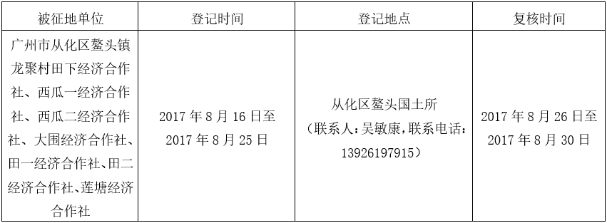 经广州市人民政府同意并经美高梅娱乐城批准(粤国土资(建)字〔2016〕644号)同意将广州市从化区鳌头镇龙聚村地段2.4237公顷集体土地征收为国有土地。现将经依法批准的《征收土地方案》、市人民政府批准的《征地补偿安置方案》内容和有关事项公告如下: