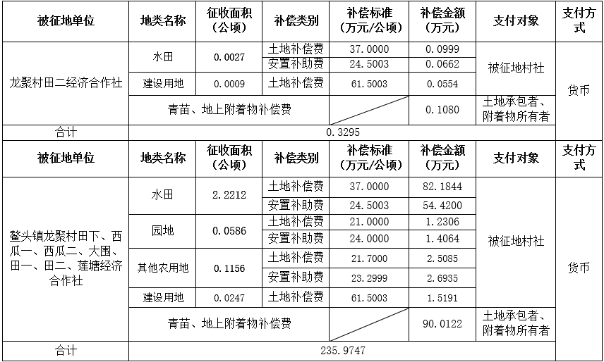 (二)本次征收土地所涉及的被安置农业人员由广州市从化区鳌头镇龙聚村田下经济合作社、西瓜一经济合作社、西瓜二经济合作社、大围经济合作社、田一经济合作社、田二经济合作社、莲塘经济合作社以货币补偿等形式安置。