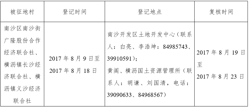 (二)本次征收土地所涉及的被安置农业人员由南沙区南沙街广隆股份合作经济联合社、横沥镇长沙经济联合社、横沥镇义沙经济联合社以货币补偿的形式安置。请南沙区南沙街广隆股份合作经济联合社、横沥镇长沙经济联合社、横沥镇义沙经济联合社在本公告期内到广州市南沙区国土资源和规划局领取办理安置农业人口征地农转非手续的函件。