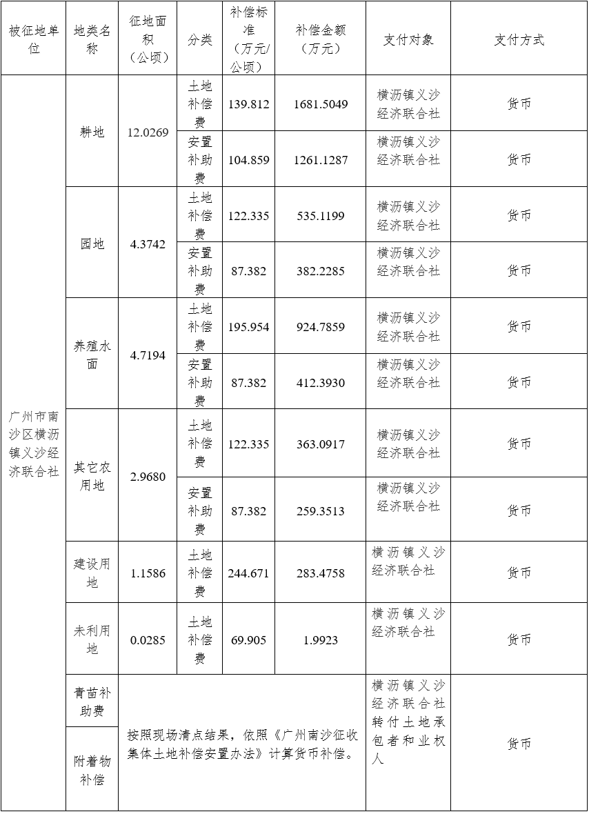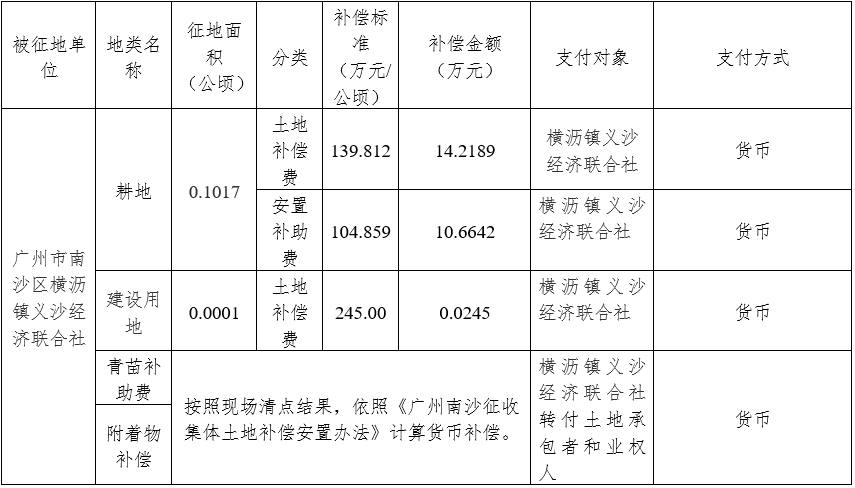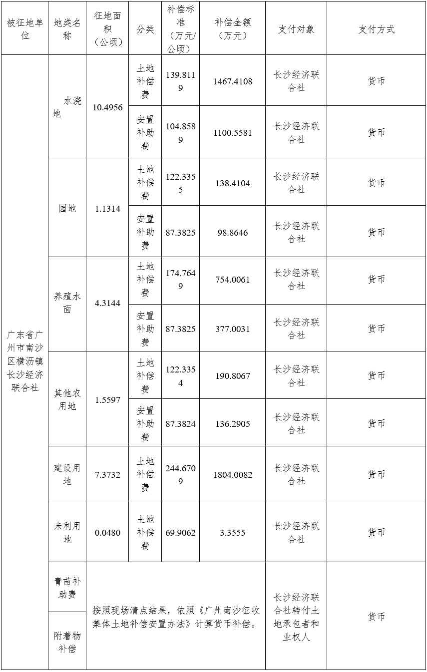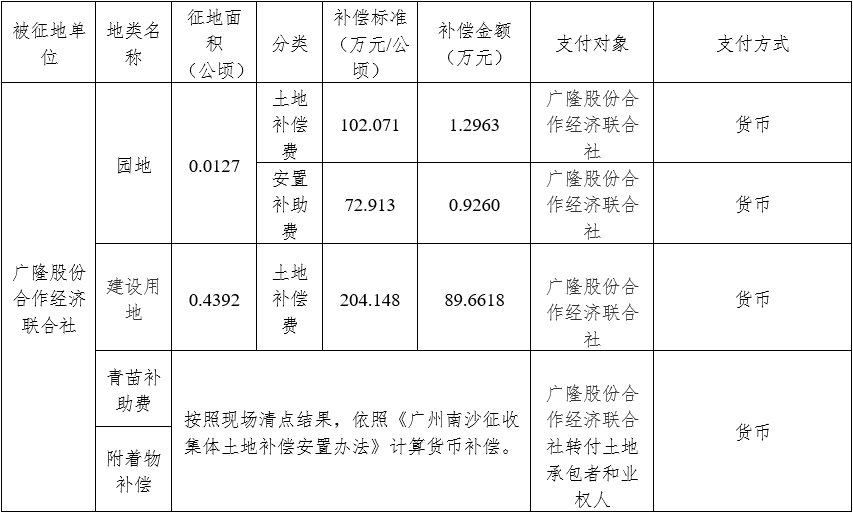 广东省广州市南沙区南沙街广隆股份合作经济联合社集体土地0.4519公顷(合6.7785亩)、广东省广州市南沙区横沥镇长沙经济联合社集体土地24.9223公顷(合373.8345亩)、广州市南沙区横沥镇义沙经济联合社集体土地0.1018公顷(合1.5270亩)、广州市南沙区横沥镇义沙经济联合社集体土地25.2756公顷(合379.1340亩)。