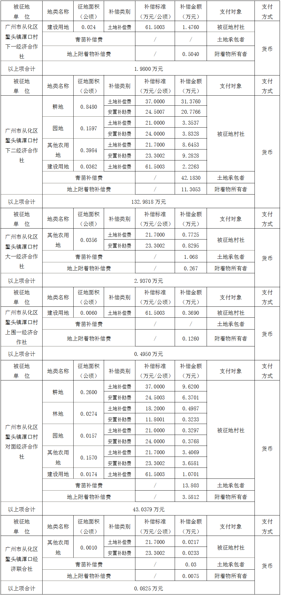 (二)本次征收土地所涉及的被安置农业人员由广州市从化区鳌头镇潭口村下一、下二、大一、上围一、对面经济合作社,潭口经济联合社以货币补偿等形式安置。