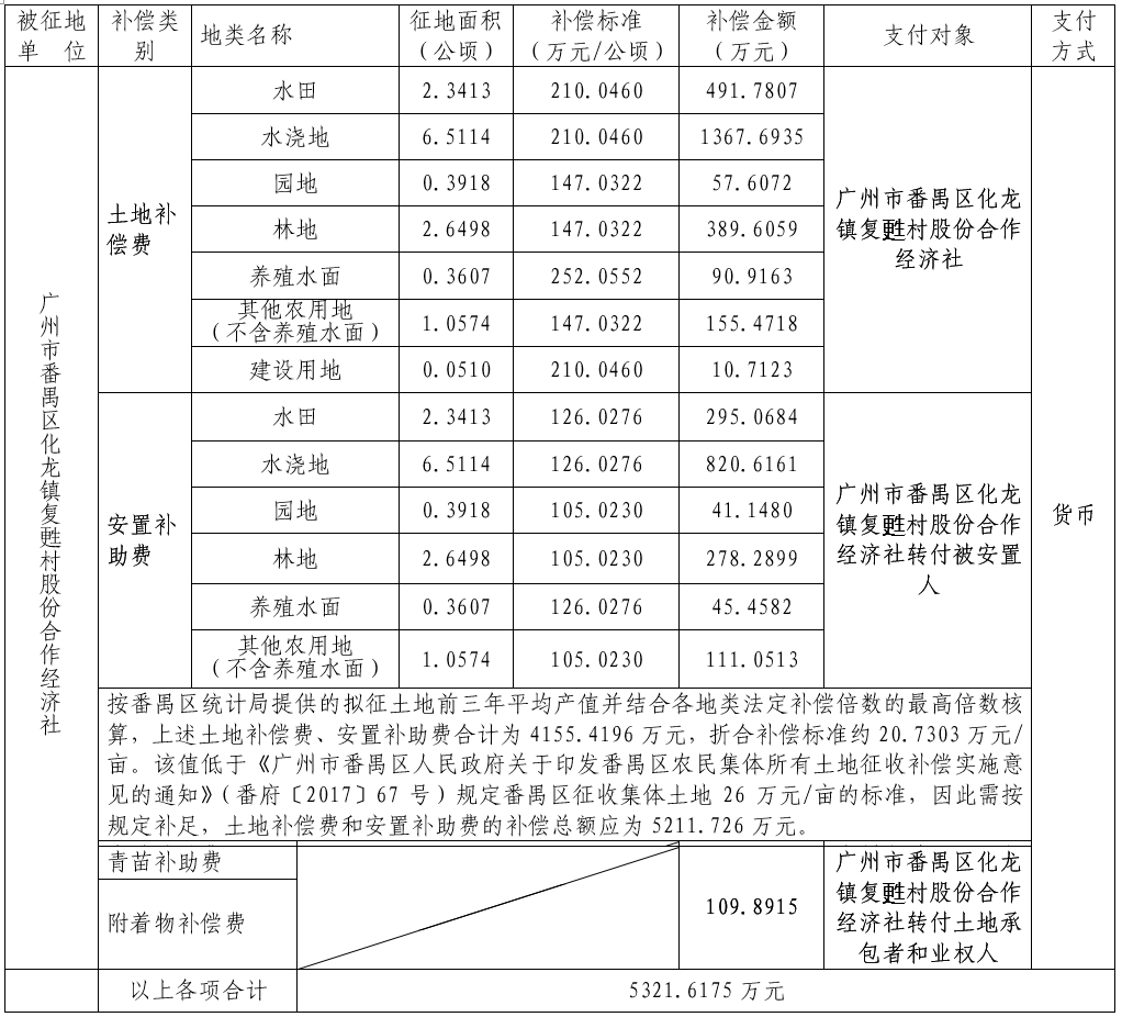 经美高梅娱乐城批准(粤府土审(02)〔2018〕60号),同意将广州市番禺区化龙镇复甦村股份经济合作社,面积共13.3634公顷集体土地征收为国有土地。现将经依法批准的《征收土地方案》、市人民政府批准的《征地补偿安置方案》内容和有关事项公告如下: