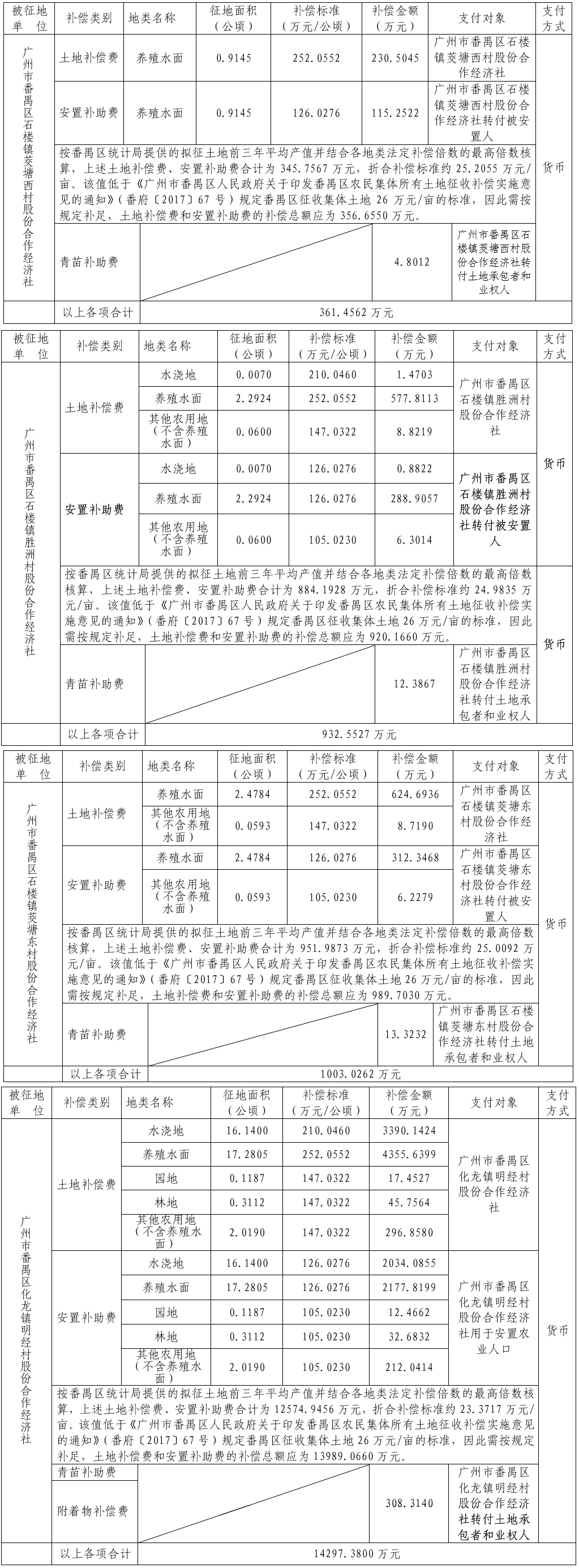 经美高梅娱乐城批准(粤府土审(02)〔2018〕63号),同意将广州市番禺区石楼镇茭塘西村股份合作经济社、石楼镇胜洲村股份合作经济社、石楼镇茭塘东村股份合作经济社和化龙镇明经村股份经济合作社,面积共41.6810公顷集体土地征收为国有土地。现将经依法批准的《征收土地方案》、市人民政府批准的《征地补偿安置方案》内容和有关事项公告如下: