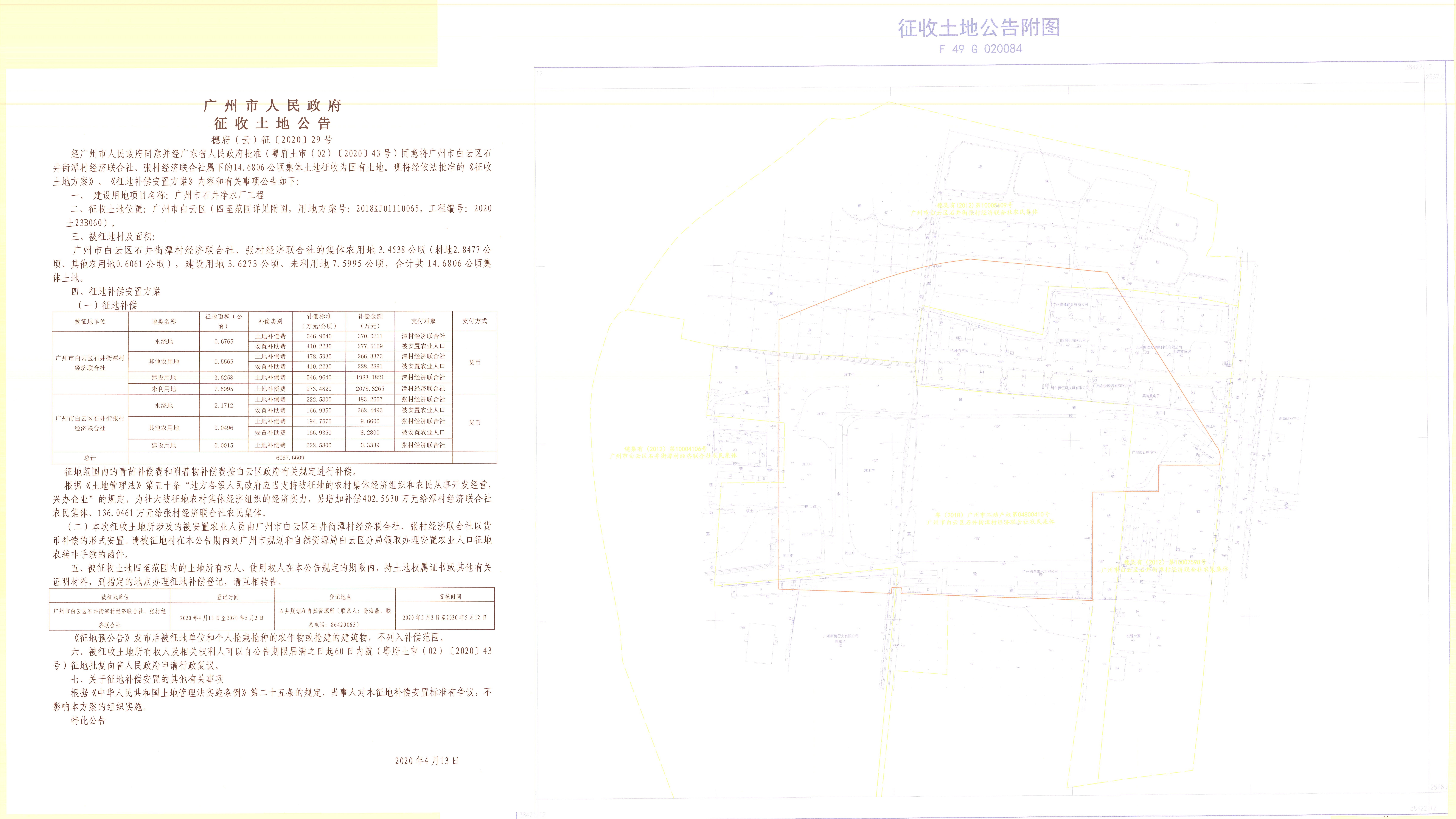 经广州市人民政府同意并经美高梅娱乐城批准(粤府土审(02)〔2020〕43号)同意将广州市白云区石井街潭村经济联合社、张村经济联合社属下的14.6806公顷集体土地征收为国有土地。现将经依法批准的《征收土地方案》、《征地补偿安置方案》内容和有关事项公告如下: