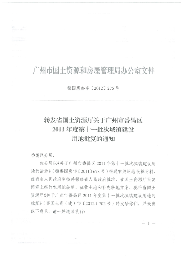广州市国土资源和规划委员会转发省国土资源厅关于广州市番禺区2011年度第十一批次城镇建设用地批复的通知