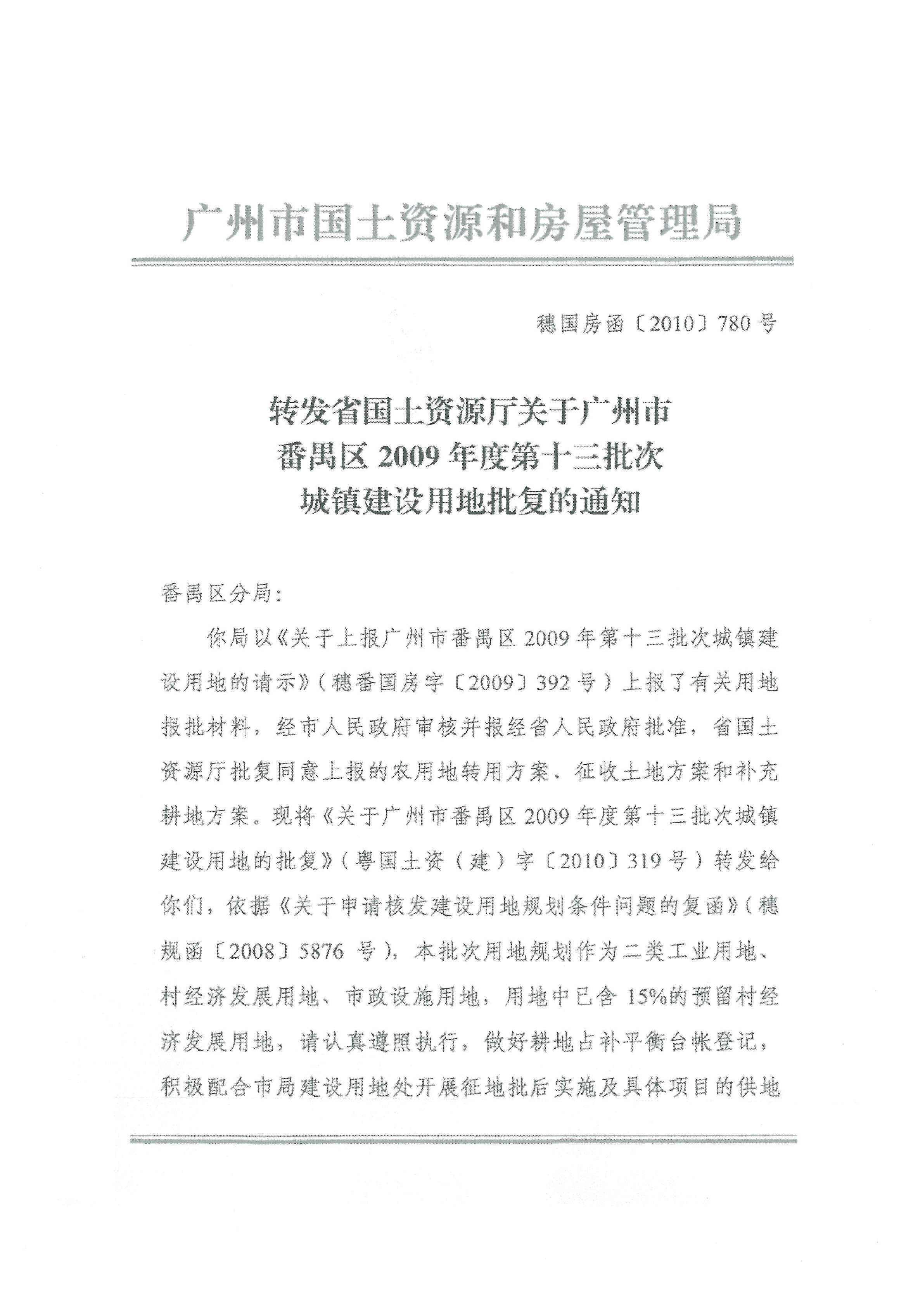 广州市国土资源和规划委员会转发省国土资源厅关于广州市番禺区2009年度第十三批次城镇建设用地批复的通知