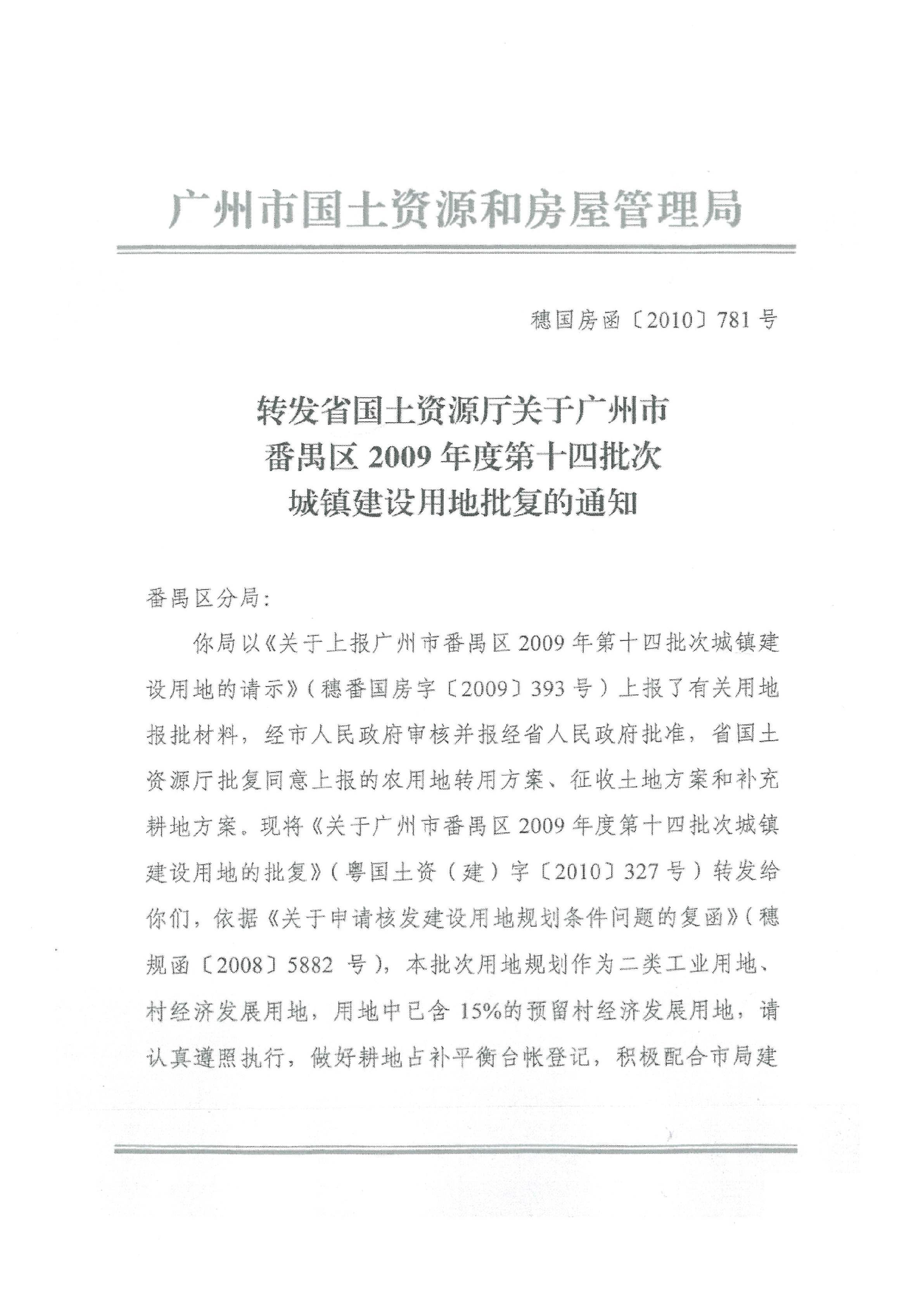 广州市国土资源和规划委员会转发省国土资源厅关于广州市番禺区2009年度第十四批次城镇建设用地批复的通知