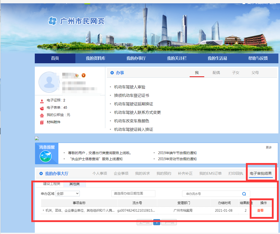 全流程网办案件办结后,电子证照和电子审批结果文件推送至企业或个人“市民网页”账户、“穗好办”和“粤省事”,同步发送送达短信至申请人预留手机。申请人通过短信指引或直接登陆“市民网页”账户下载查阅电子审批结果。