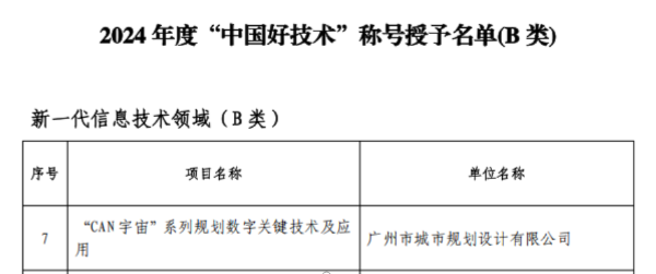 近日,中国生产力促进中心协会正式公布2024年度“中国好技术”项目库入选名单广州市城市规划设计有限公司(以下简称“市城规公司”)自主研发的“‘CAN宙’系列规划数字关键技术及应用”项目成功入选“中国好技术”项目库-B类(新一代信息技术领域),并荣获2024年度“中国好技术”称号这一国家级荣誉,标志着市城规公司在规划数智化领域的自主创新成果获得权威认可。