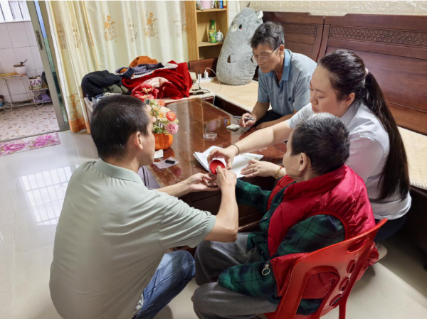 “婆婆请开门,我们上门给您办理登记业务!”工作人员来到已无法自主行动的婆婆家开展上门受理服务,现场核验、收取相关材料。在亲属的陪同与帮助下,婆婆颤颤巍巍地在登记申请表上印好了指纹,眼角的笑意是对暖心服务的认可与放心。