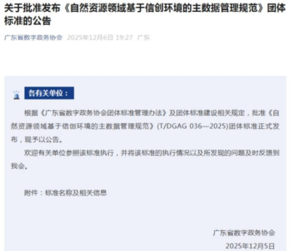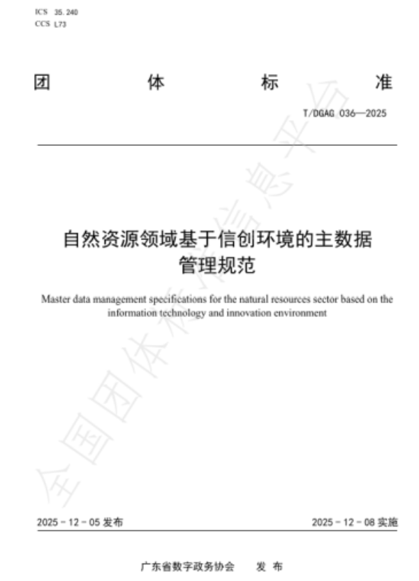 近日,由广州市基础地理信息中心牵头编制的《自然资源领域基于信创环境的主数据管理规范》(以下简称《规范》)已通过审批并正式发布。该《规范》作为一项团体标准,旨在为自然资源相关单位在信创环境下开展主数据管理提供统一的工作指引。
