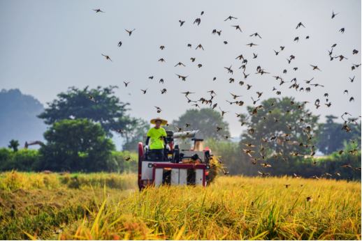 隆平稻香园秋收图景:收割机穿行稻浪伴飞鸟翩跹