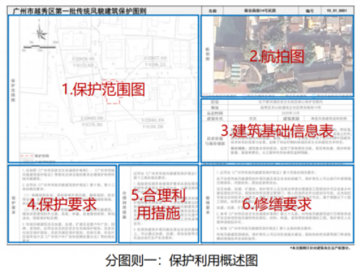 越秀区第一至三批共71处传统风貌建筑,大多数位于历史文化街区内,以民国时期建筑为主,展现了近代广府地区住宅、商住建筑的特色形式与传统风貌,反映了广州特定时期的地域历史文化和建筑艺术特色。本次按照“明确底线、延续生机、能管能用”的思路,为每栋传统风貌建筑“量身定制”保护图则,为其保护利用提供技术支撑。