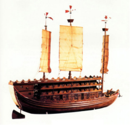 明清闭关自守平忧患,“广船”雄风声名鹤立。明初广州造船业一改宋元时期海上贸易的发展导向,转而侧重于内河航运和海防建设。此时建造的“广船”是中式帆船优秀船型之一,有着巨大的船身、坚硬的材质、巨幅扇形的船帆和采用多孔舵等特征,兼具内河运输、贸易和军事防御功能。