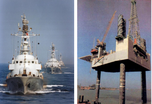 黄埔船厂建造的“中华第一艇”(左)和“华海一号”钻井平台(右)