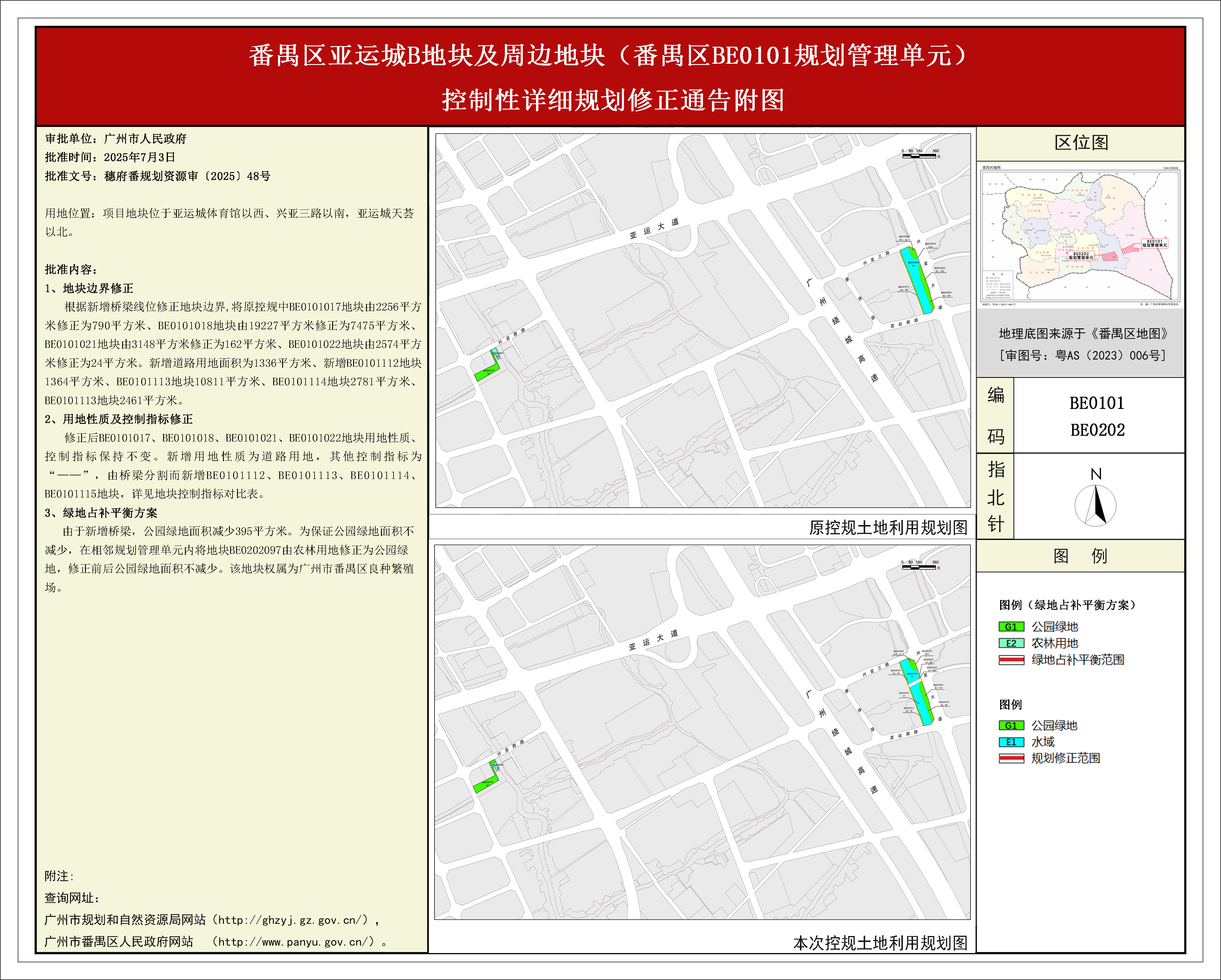 根据《广东省城市控制性详细规划管理条例》、《广州市人民政府关于将一批市级行政职权事项继续委托区实施的决定》(穗府〔2019〕8号)、《广州市人民政府关于收回一批市级行政权力事项的决定》(广州市人民政府令第188号),《番禺区亚运城B地块及周边地块(番禺区BE0101规划管理单元)控制性详细规划修正》规划成果已完成规划技术审查、批前公示、征询相关单位意见等程序,并经区政府常务会议审议通过后获广州市人民政府批准(穗府番规划资源审〔2025〕48号),自批准之日(2025年7月3日)起生效。