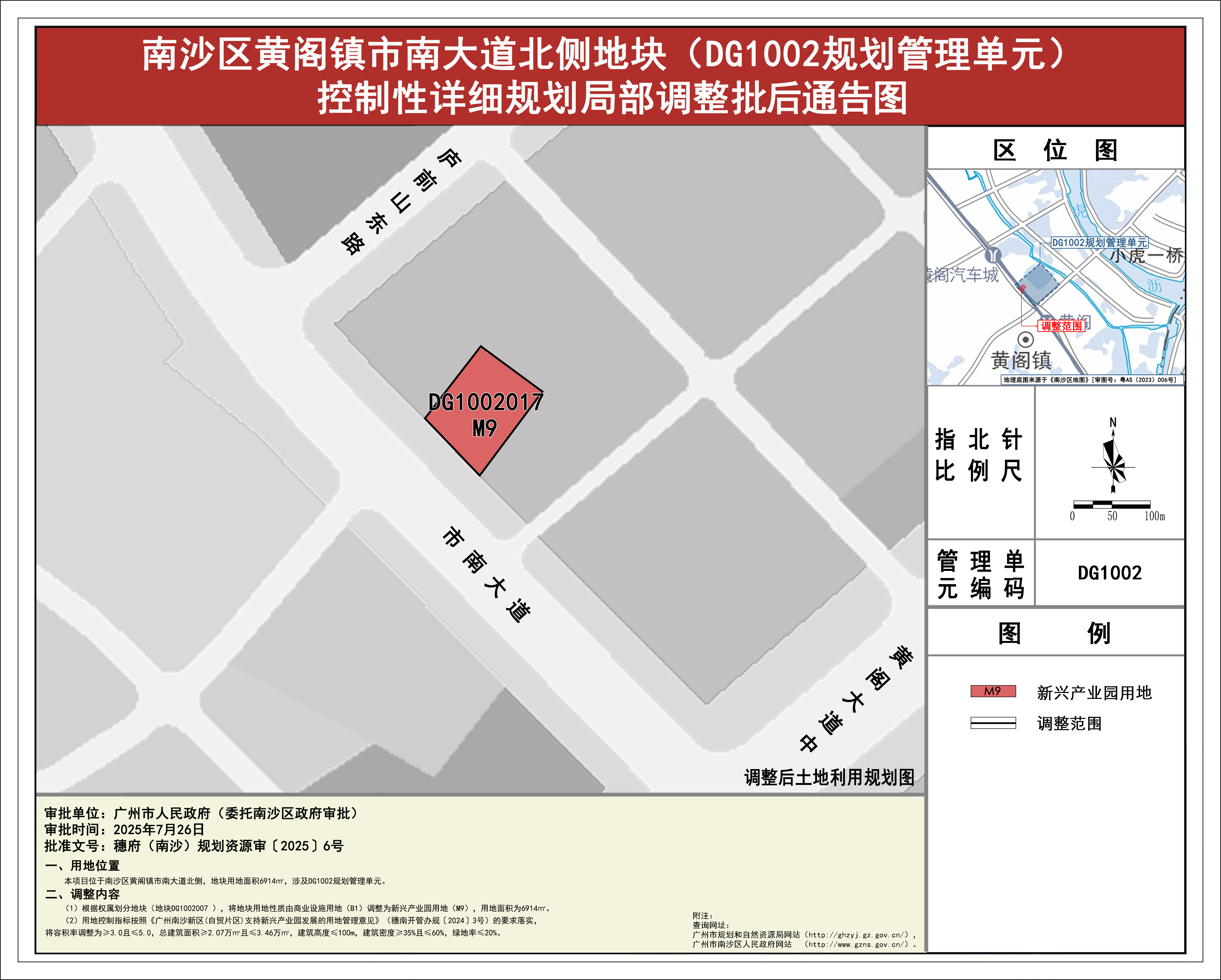 根据《广东省城市控制性详细规划管理条例》《广州市城乡规划程序规定》有关规定,《南沙区黄阁镇市南大道北侧地块(DG1002规划管理单元)控制性详细规划局部调整》已完成规划技术审查、批前公示等程序,并经广州市南沙新区自然资源规划与利用委员会审议通过后获广州市南沙区人民政府(受广州市人民政府委托)批准(穗府(南沙)规划资源审〔2025〕6号),自批准之日(2025年7月26日)起生效。