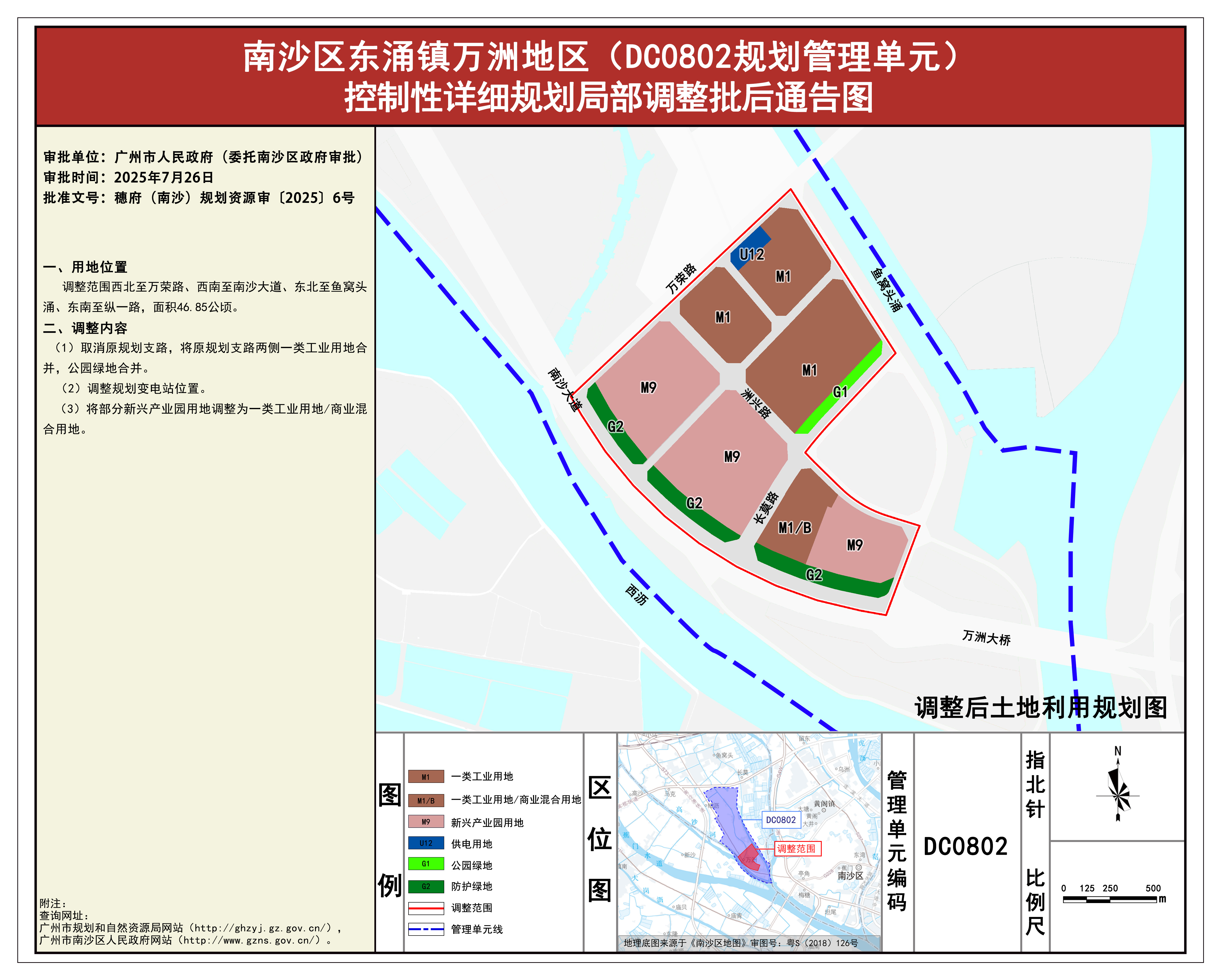 根据《广东省城市控制性详细规划管理条例》《广州市城乡规划程序规定》有关规定,《南沙区东涌镇万洲地区(DC0802规划管理单元)控制性详细规划局部调整》已完成规划技术审查、批前公示等程序,并经广州市南沙新区自然资源规划与利用委员会审议通过后获广州市南沙区人民政府(受广州市人民政府委托)批准(穗府(南沙)规划资源审〔2025〕6号),自批准之日(2025年7月26日)起生效。