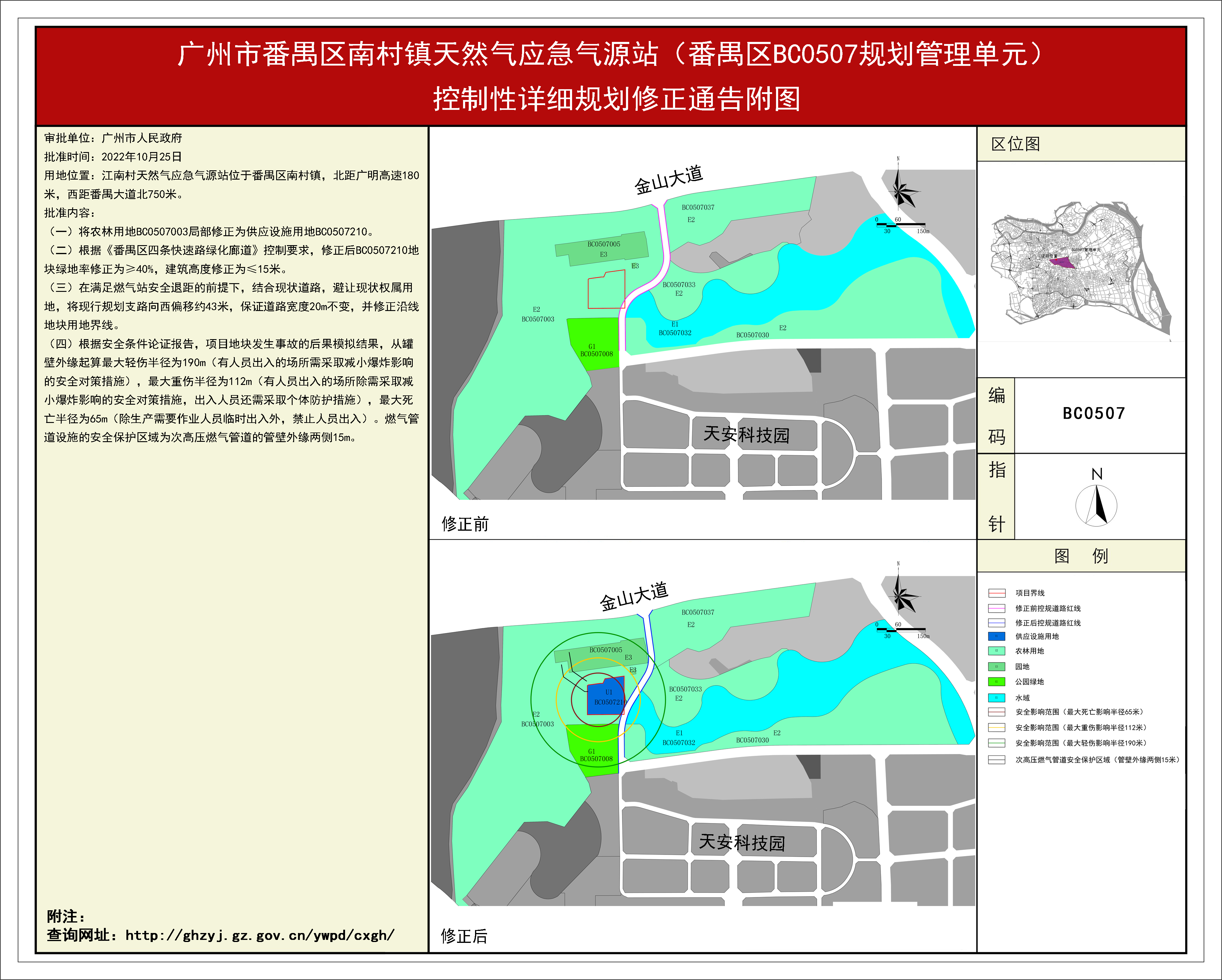 根据《广东省城市控制性详细规划管理条例》、《广州市人民政府关于将一批市级行政职权事项继续委托区实施的决定》(穗府[2019]8号)、《广州市人民政府关于收回一批市级行政权力事项的决定》(广州市人民政府令第188号),《广州市番禺区南村镇天然气应急气源站(番禺区BC0507规划管理单元)控制性详细规划修正》规划成果已完成规划技术审查、批前公示等程序,并经番禺区土地和规划领导小组会议审议通过后获广州市人民政府批准,自批准之日(2022年10月25日)起生效。