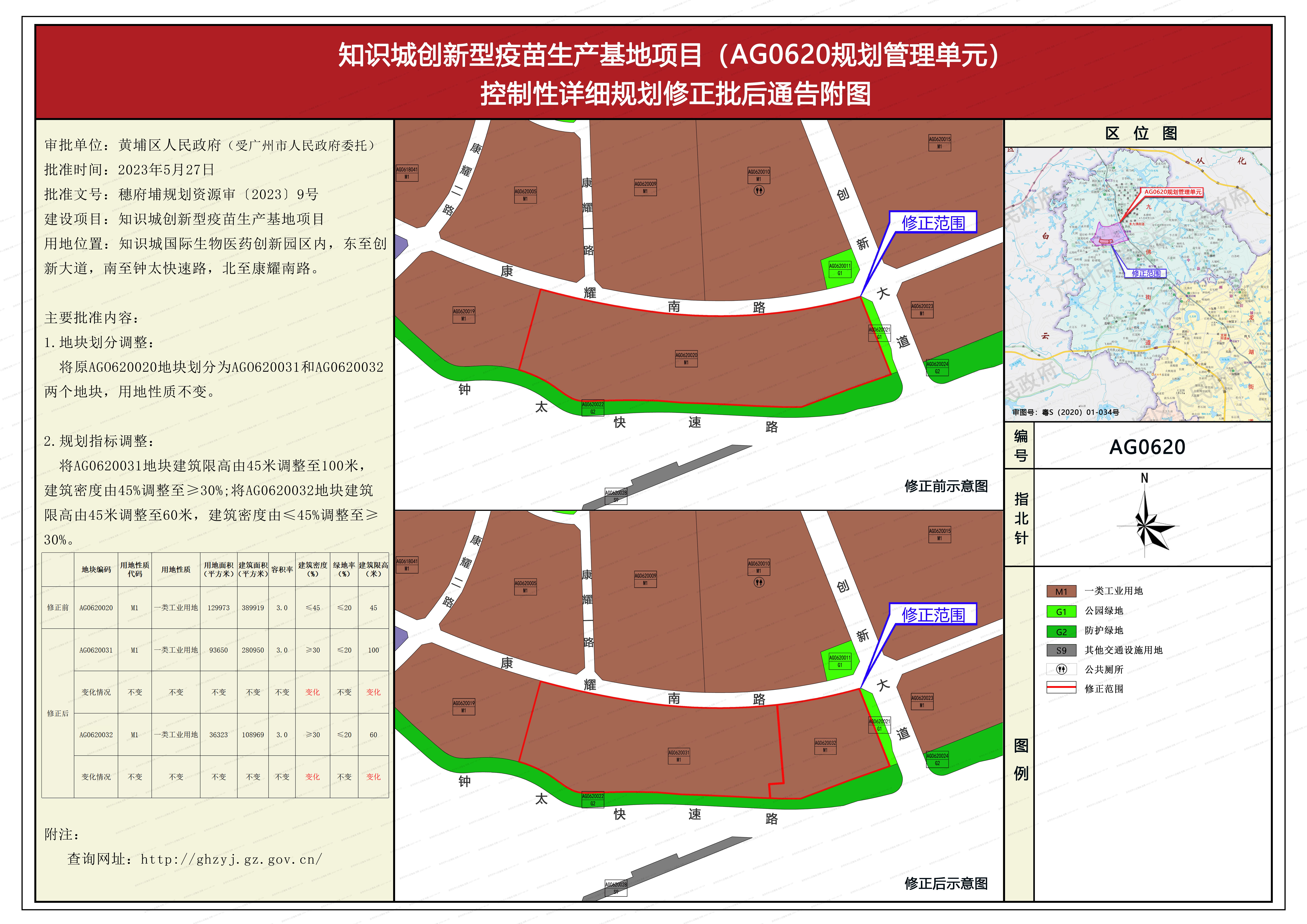 根据《广东省城市控制性详细规划管理条例》有关规定,《知识城创新型疫苗生产基地项目(AG0620 规划管理单元)控制性详细规划修正方案》已获广州市黄埔区人民政府批准(受广州市人民政府委托)(穗府埔规划资源审〔2023〕9号),自批准之日(2023年5月27日)起生效。