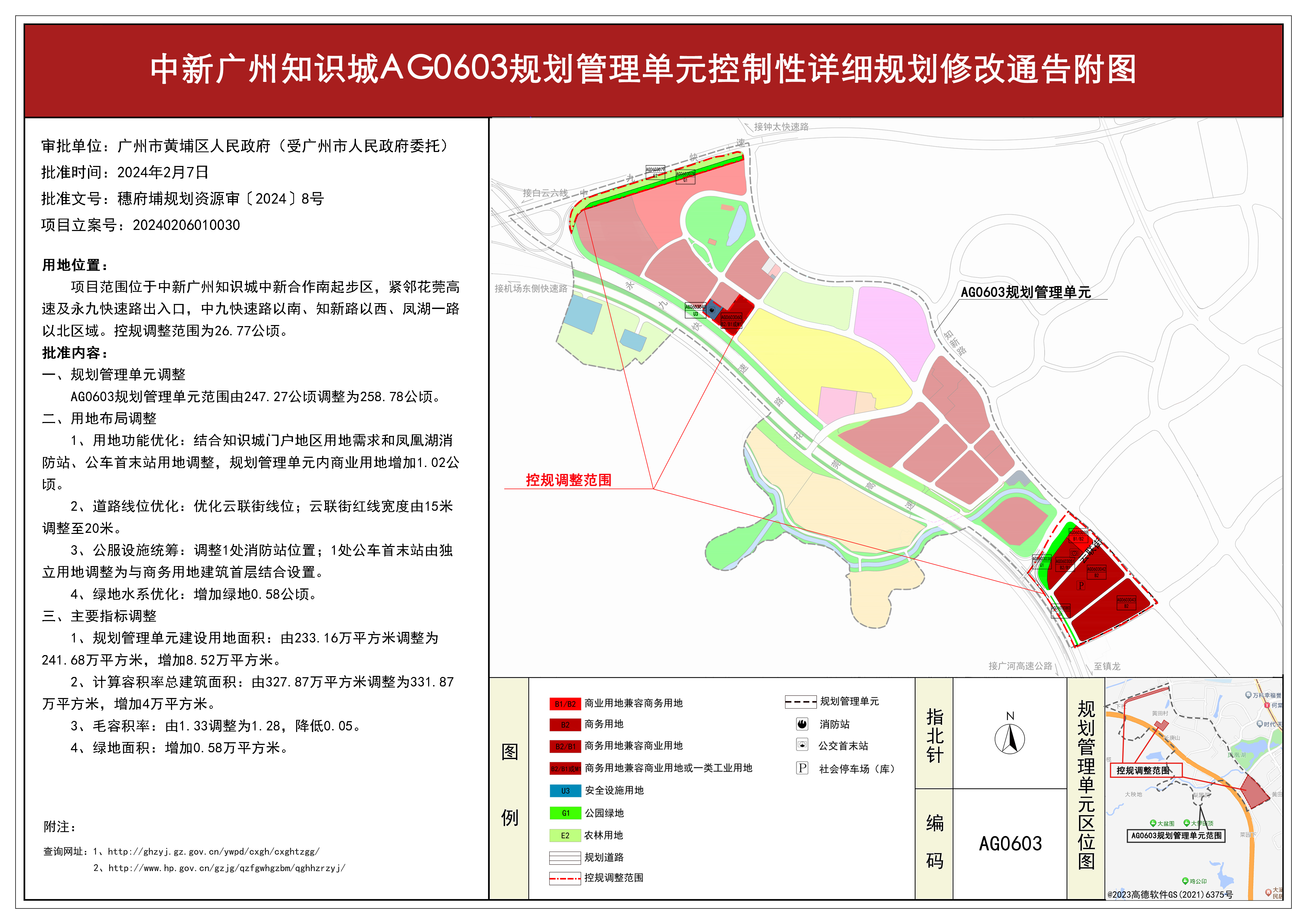 根据《广东省城市控制性详细规划管理条例》有关规定,《中新广州知识城AG0603规划管理单元控制性详细规划修改》已获广州市黄埔区人民政府批准(受广州市人民政府委托)(穗府埔规划资源审〔2024〕8号),自批准之日(2024年2月7日)起生效。