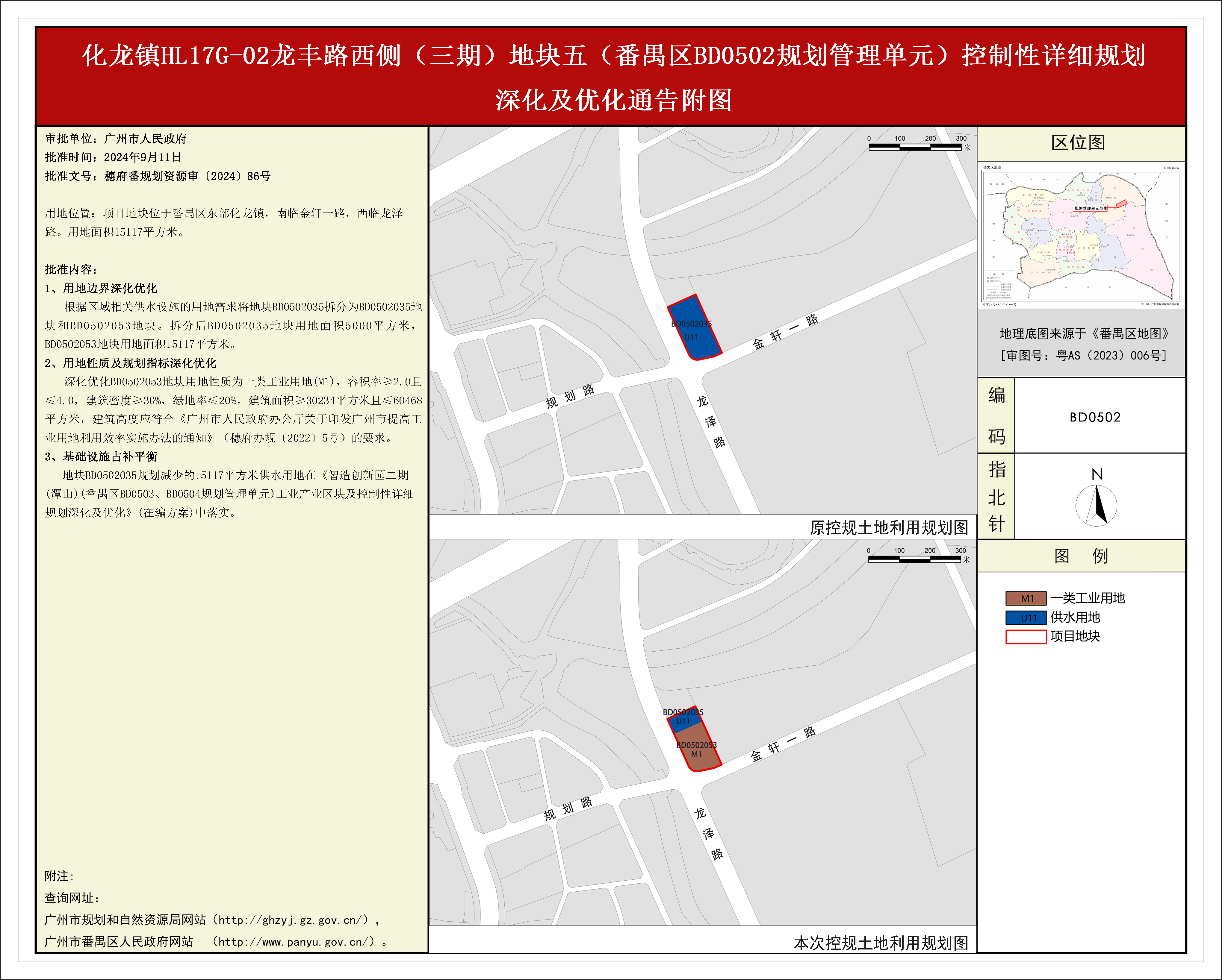 《化龙镇HL17G-02龙丰路西侧(三期)地块五(番禺区BD0502规划管理单元)控制性详细规划深化及优化》规划成果已完成规划技术审查、批前公示、征询相关单位意见等程序,并经番禺区土地和规划领导小组会议审议通过后获广州市人民政府批准(穗府番规划资源审﹝2024﹞86号),自批准之日(2024年9月11日)起生效。