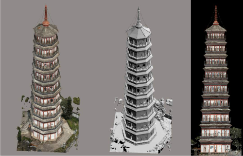 在琶洲塔文物修缮过程中,测绘人员采用M300无人机,基于地形图数据进行三维航线规划,并通过抽稀航线的方式实现旁向重叠度对比试验,试验制作了琶洲塔高精度实景三维模型及立面纹理图,为开展琶洲塔后续修缮、维护提供高精度真实三维数据。
