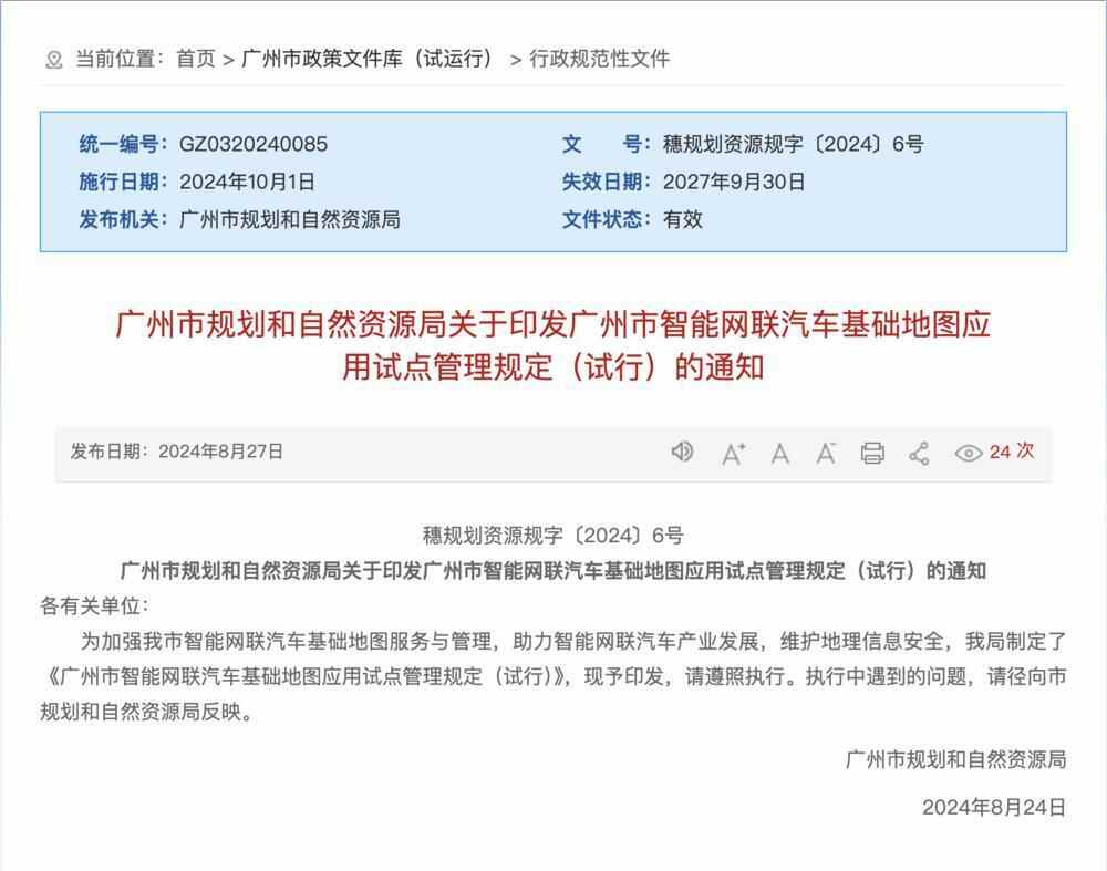 《规定》指出,广州市政府有关部门和单位鼓励智能网联汽车基础地图测绘科学技术的创新和进步,支持不同技术路线、多元应用场景下的智能网联汽车基础地图测试验证,推动新技术、新产品、新业态的先行先试和示范应用,促进智能网联汽车基础地图产业发展。该《规定》自2024年10月1日起施行,有效期三年。