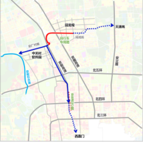 自行车专用路西延工程于2020年7月投入使用,西延工程长3.8公里,与回龙观至上地的自行车专用路连接,西延后全长达10.3公里,践行“慢行优先”理念,首次实施路口自行车一次性左转。目前,专用路“东拓”“南展”工程也在规划建设中。