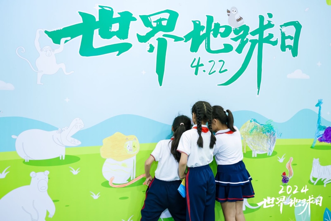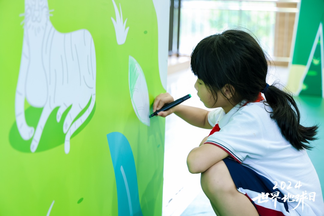 在“世界地球日”环保涂鸦墙前,同学们争相拿起画笔,在墙上绘制出大自然的色彩。