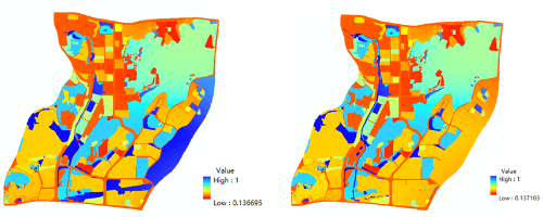 大观湿地降温效果模拟,左图为现状;右图为廊道灭失情景