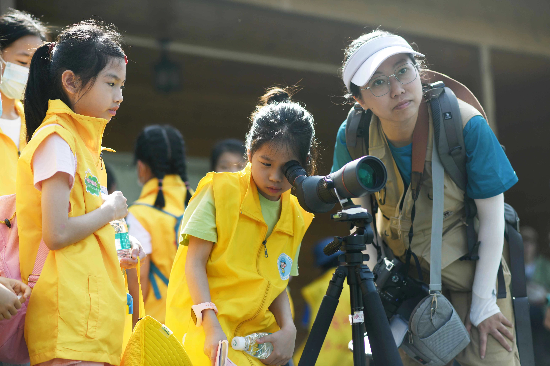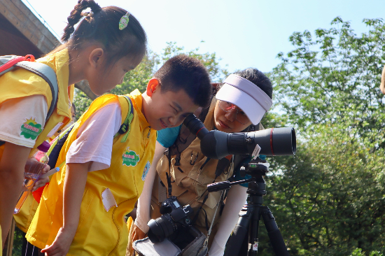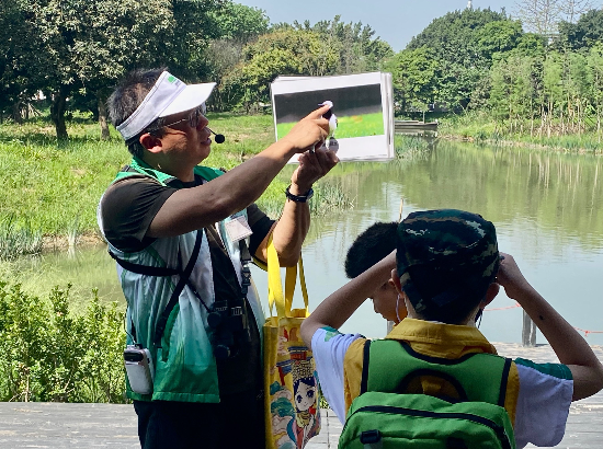 穿过一条幽径,走过一座石桥,小记者们来到了本次活动观鸟的地点。在这里,讲解员“肥牛”老师用幽默风趣的语言向大家传授了观鸟的技巧和望远镜的使用方法。小记者们跃跃欲试,争先恐后地走上前去用单筒望远镜观鸟。