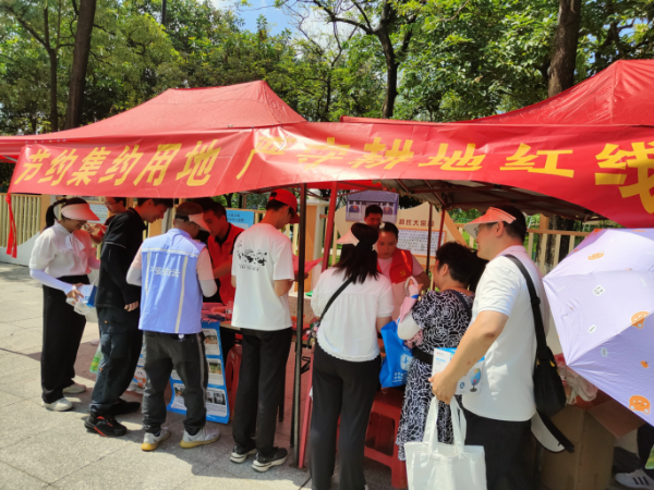 在金沙街,白云区分局开展了宣传咨询活动。现场设置咨询台,接受群众咨询,用通俗易懂的语言面对面解答群众关于耕地保护、土地利用、地质灾害防治等方面的疑惑,增强群众对于保护耕地、节约集约和依法依规用地的意识。